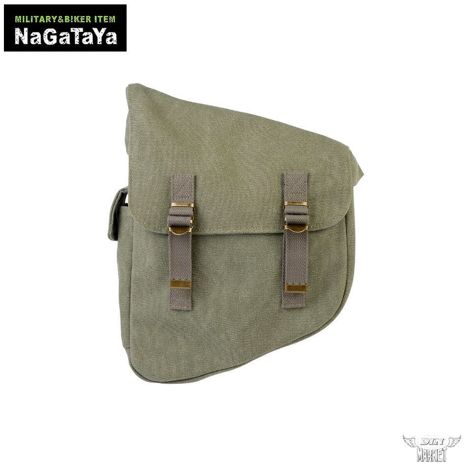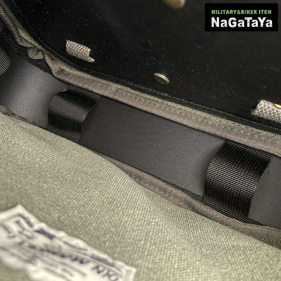 素材はキャンバス地をウォッシュ加工したヴィンテージクロス仕上げ。撥水、防水加工などはせず、見た目のカッコ良さに拘ったスタイル。ファスナーやプラスチックを使用しないことで装着したその瞬間から、クラシックでヴィンテージな雰囲気を楽しめる。収納サイズは工具やレインウェア、1泊分の着替えが入る程度を想定して設計している。前側側面には、プラグやレンチ、ドライバーなど頻繁に使用するアイテムが収納可能なサイドポケットを装備。脱落防止のためスナップボタン仕様を採用。背面のベルト通し部分は牛革で補強をしている。ただし、ベルト自体の素材については革だと経年で硬くなり割れてしまう可能性があるため、コットン素材を採用。上蓋の両側側面はフラップを付けて雨や砂が入らないように設計。金具類はヴィンテージ感のあるアンティークブラスで統一。背面内側は芯材のベルポーレンと生地を重ね縫いすることで強度を保ち、側面と底面は型崩れしないようベルポーレンで補強している。