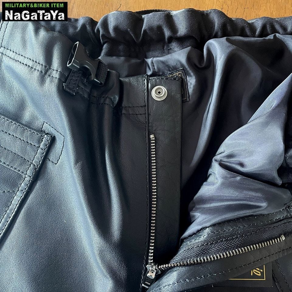 ■裾にかけてテーパードを効かせたレザーライドギアパンツ。 履き心地を考慮して軽く・弾力性のあるバッファローレザー(水牛革)を使用。 脇腰には70年代MXパンツによく見るクロスステッチの腰パッドをアレンジした大型ポケットを装備。 グローブや帽子等の大型小物の収納を可能にしました。 ウエスト部分には着脱・着心地を考慮しウェビングテープ(調整可能)仕様。