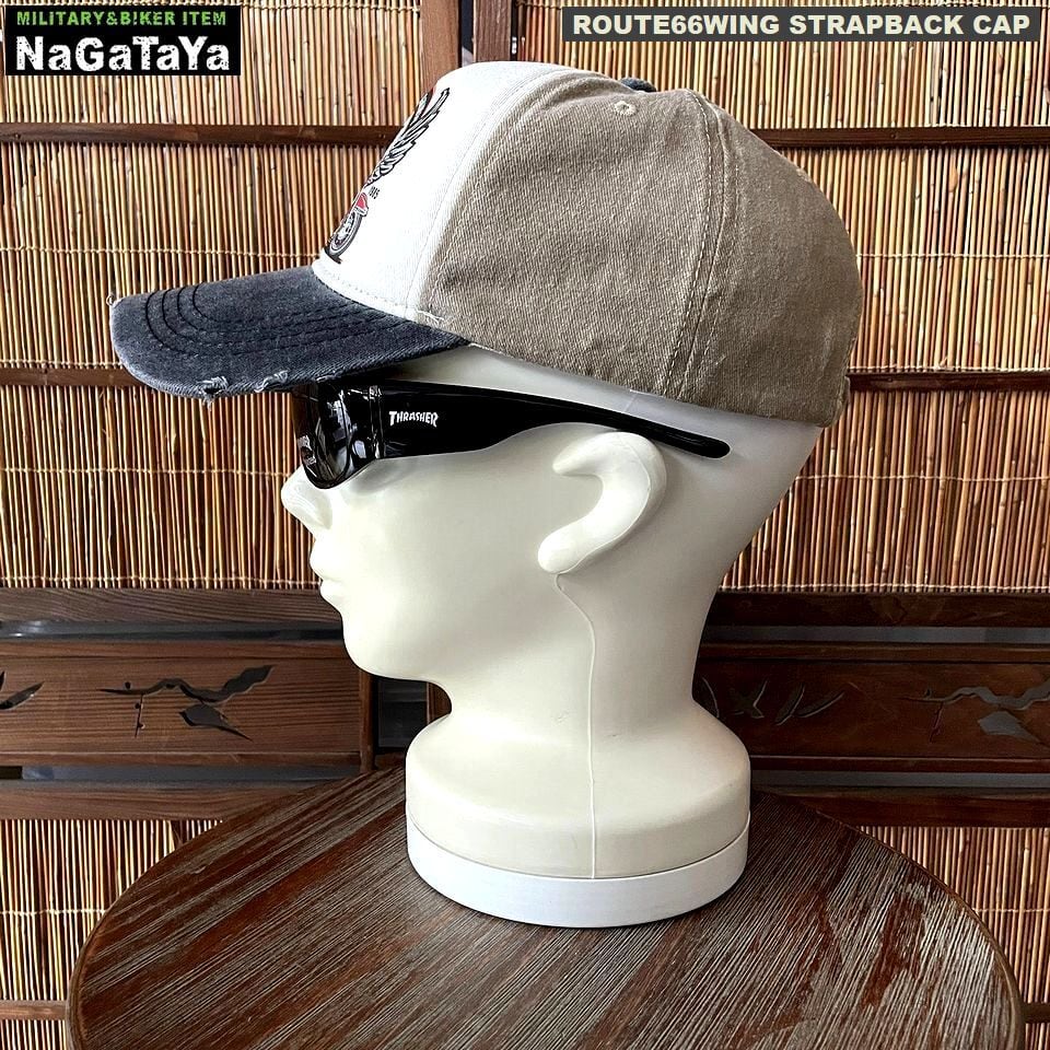 ★ROUTE66 WING ルート66 ハーレーダビッドソン パンヘッド プリント ストラップバックCAP ビンテージ加工 フリーサイズ