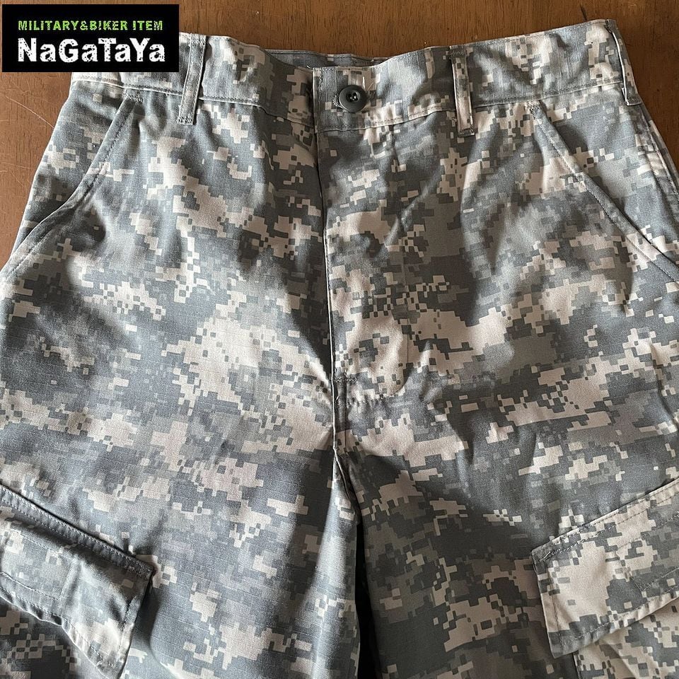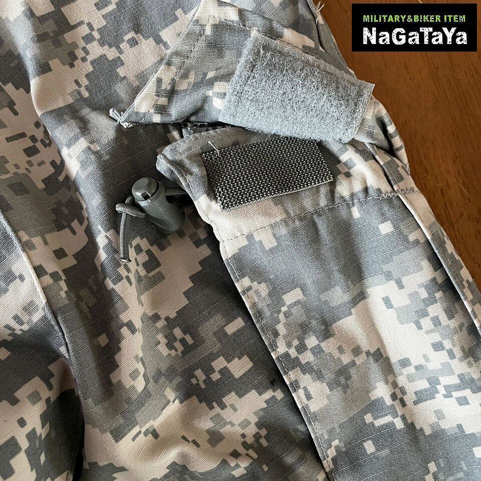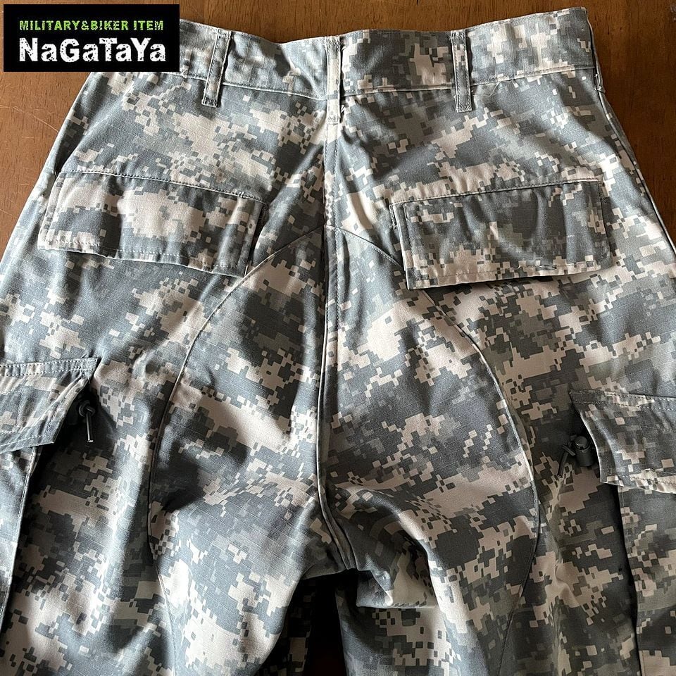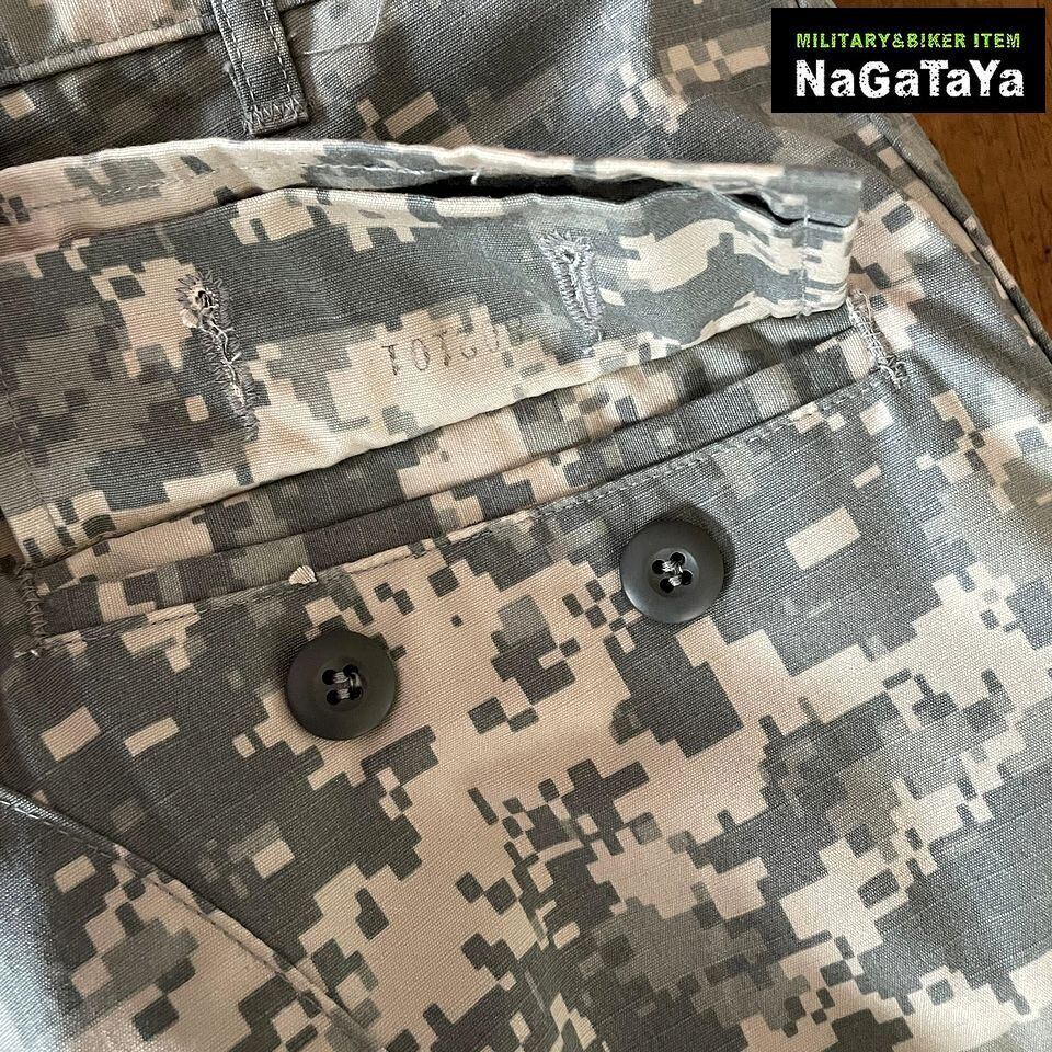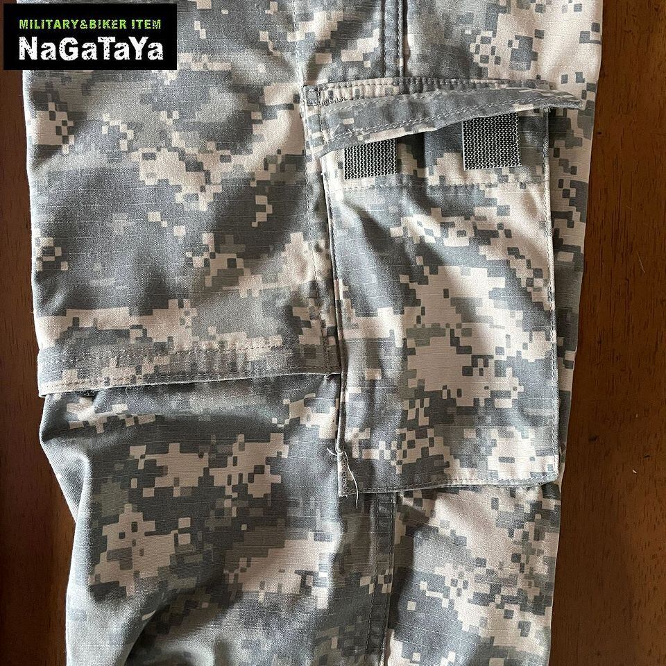 ■米軍実物のACUコンバットパンツで、アメリカンアパレル社製になります。陸軍においてBDUの後継として2005年から配備が始まった戦闘服のパンツで、UCP(Universal Camouflage Pattern)と呼ばれるデジタル迷彩が採用されました。デザイン的な改良点はウエスト調節がアジャスターから紐へ変更、角度がついたカーゴポケットの入り口、膝下サイドのポケット追加、ひざ部分のパットを入れられるスペース等が挙げられます。ポケットは左右の腰、カーゴ、膝下、後ろに計8ヶ所です。裾は紐で絞ることができます。
