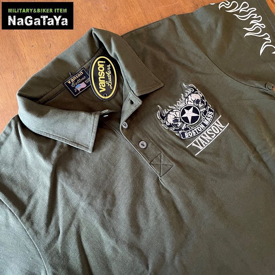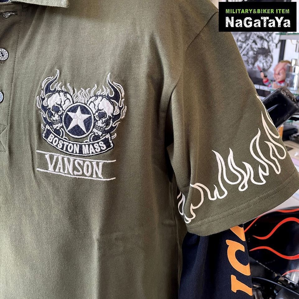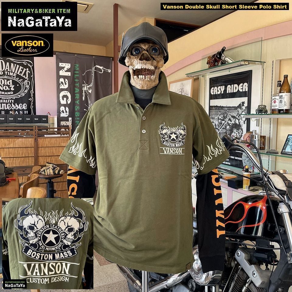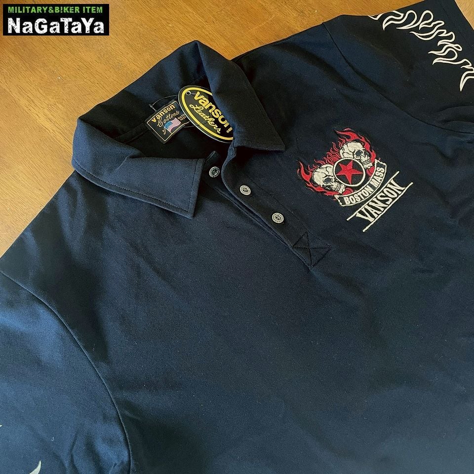VANSON バンソン ダブルスカル フレイム ロゴ刺繍 天竺 半袖ポロシャツ メンズ NVPS-002 バイカーウェア