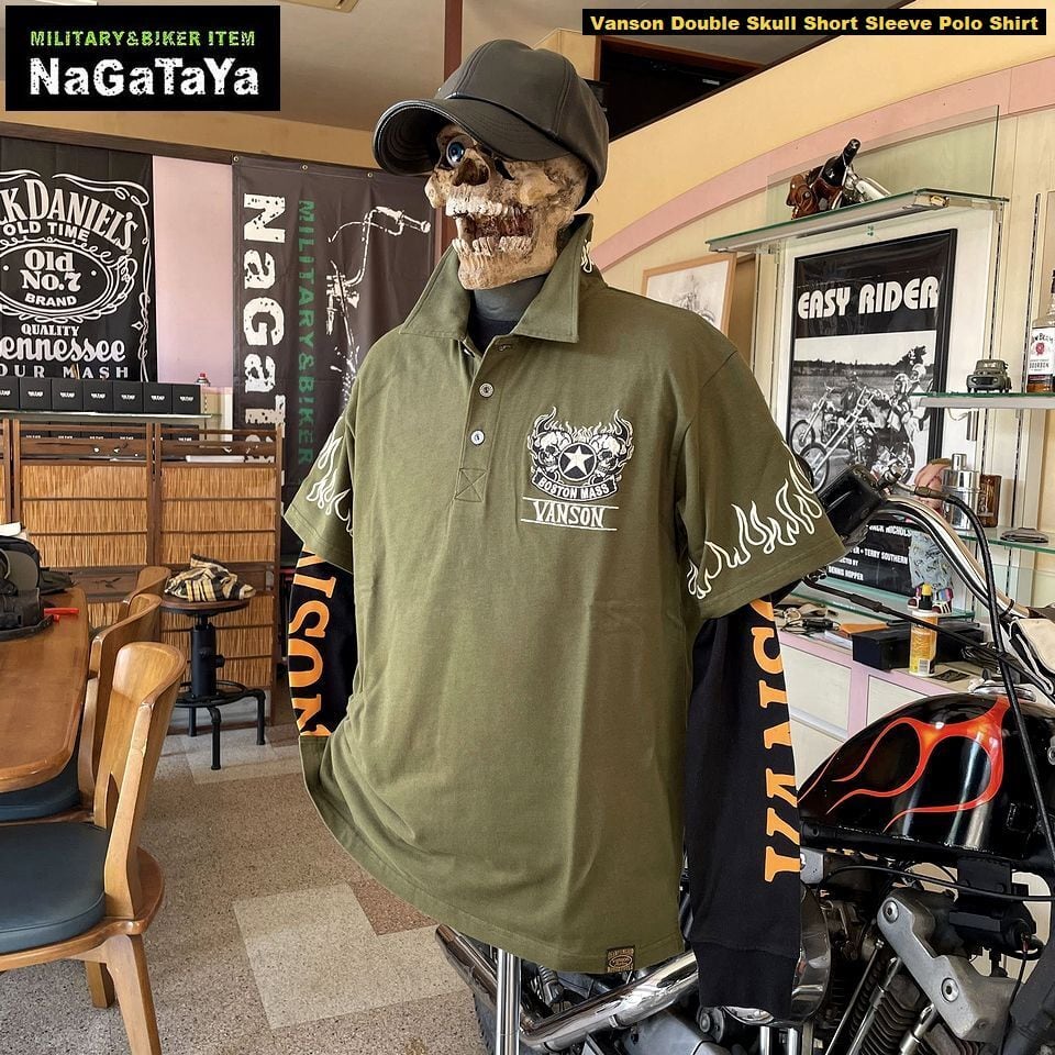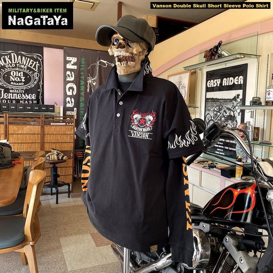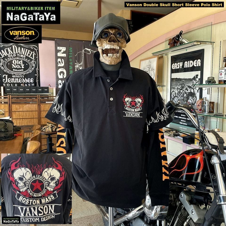 ■VANSONのダブルスカルデザインが印象的な半袖ポロシャツ。柔らかな天竺素材を使用し、快適な着心地を実現しています。袖のフレイムがアクセントとなり、スタイリッシュでありながら存在感のある一枚に仕上がっています!バイカーウェアとしてだけでなく、カジュアルスタイルにもぴったりなアイテムです。