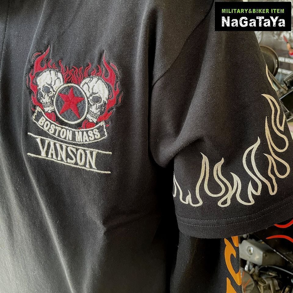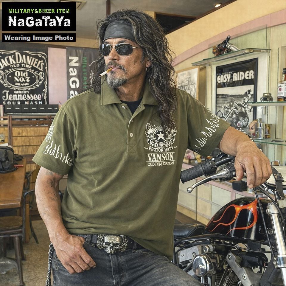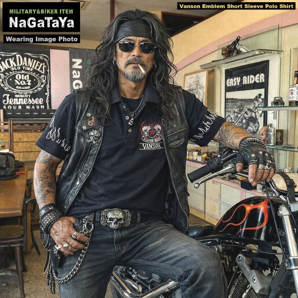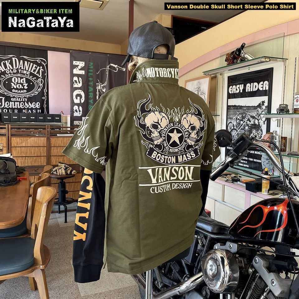 ■VANSONのダブルスカルデザインが印象的な半袖ポロシャツ。柔らかな天竺素材を使用し、快適な着心地を実現しています。袖のフレイムがアクセントとなり、スタイリッシュでありながら存在感のある一枚に仕上がっています!バイカーウェアとしてだけでなく、カジュアルスタイルにもぴったりなアイテムです。