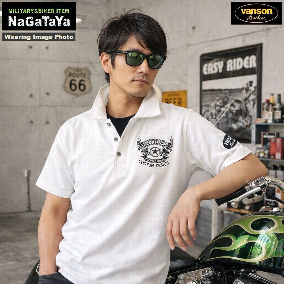 VANSON バンソン ウイングエンブレム ロゴ刺繍 天竺 半袖ポロシャツ メンズ NVPS-001 バイカーウェア