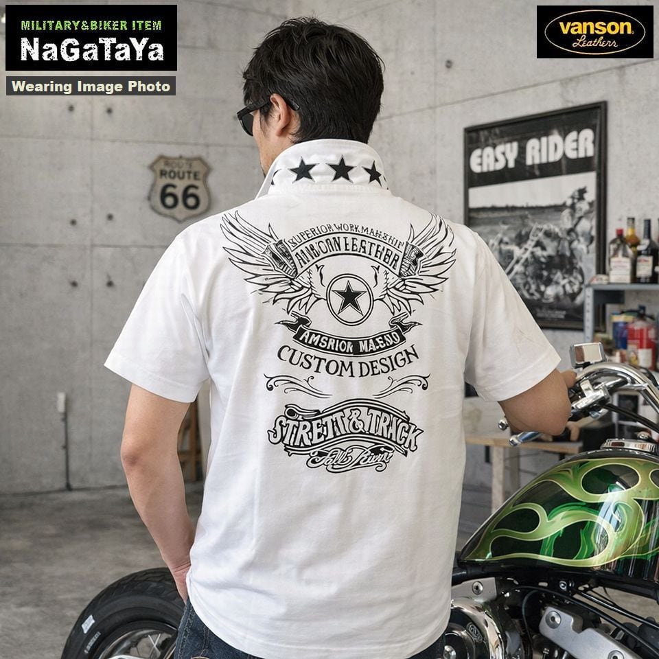 ★VANSON バンソン ウイングエンブレム ロゴ刺繍 天竺 半袖ポロシャツ メンズ NVPS-001 バイカーウェア