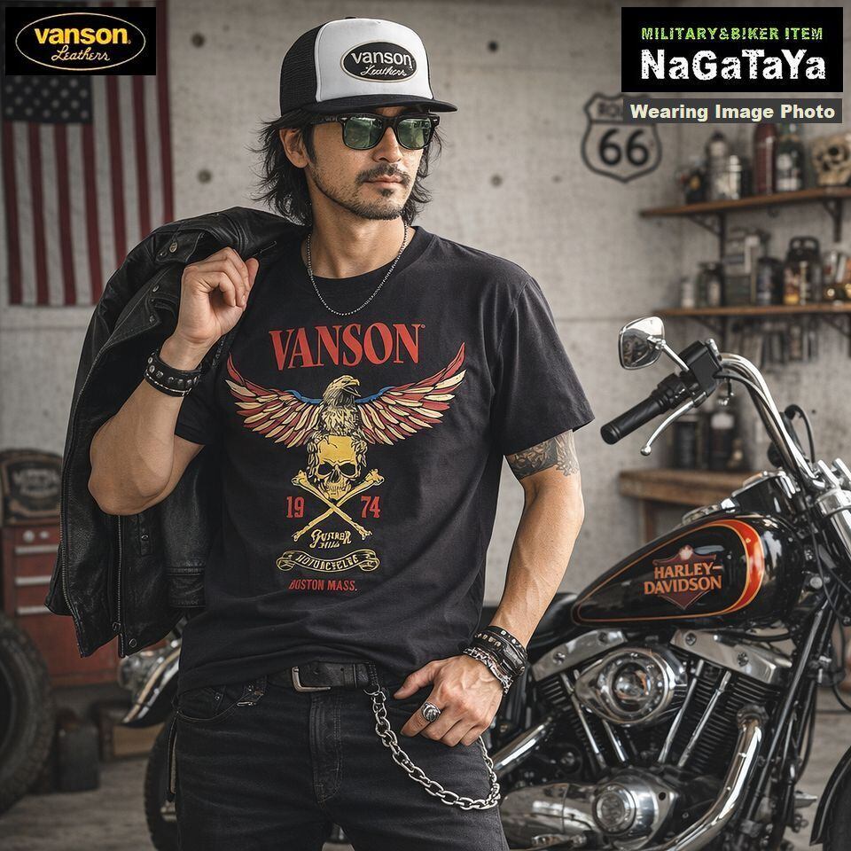 ■バンソンのスカルイーグル半袖Tシャツ。独自のスカルイーグルプリントが施され、バイカーとしてのスタイルを際立たせます。天竺生地を使用し、肌触りが良く、通気性も確保しているため、快適な着用感を提供します。墨黒のカラーは、古着スタイルにも合わせやすく、カジュアルシーンからバイクライディングまで幅広く活躍します。