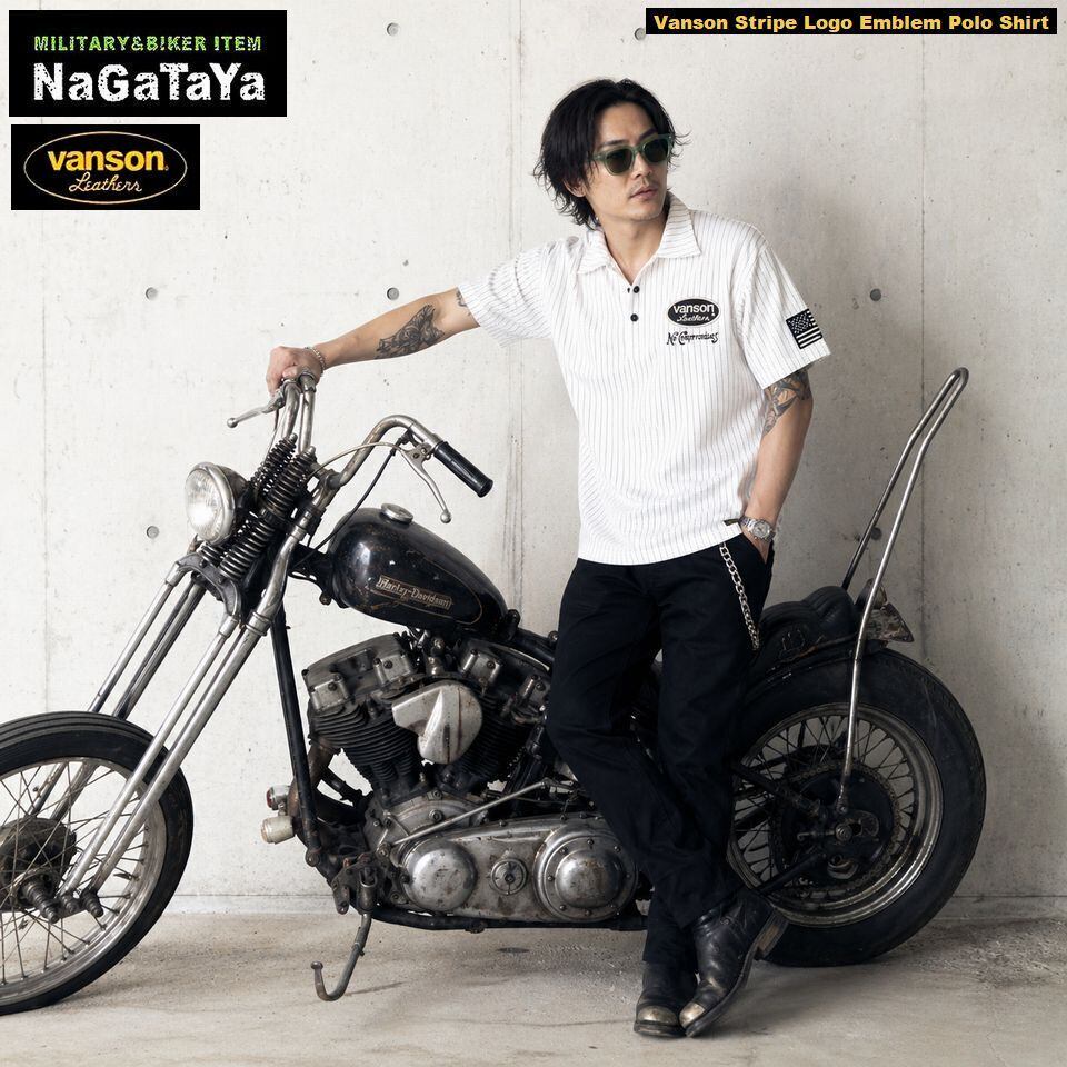 VANSON バンソン ストライプ ロゴエンブレム 刺繍 天竺 半袖ポロシャツ メンズ NVPS-2604 バイカーウェア