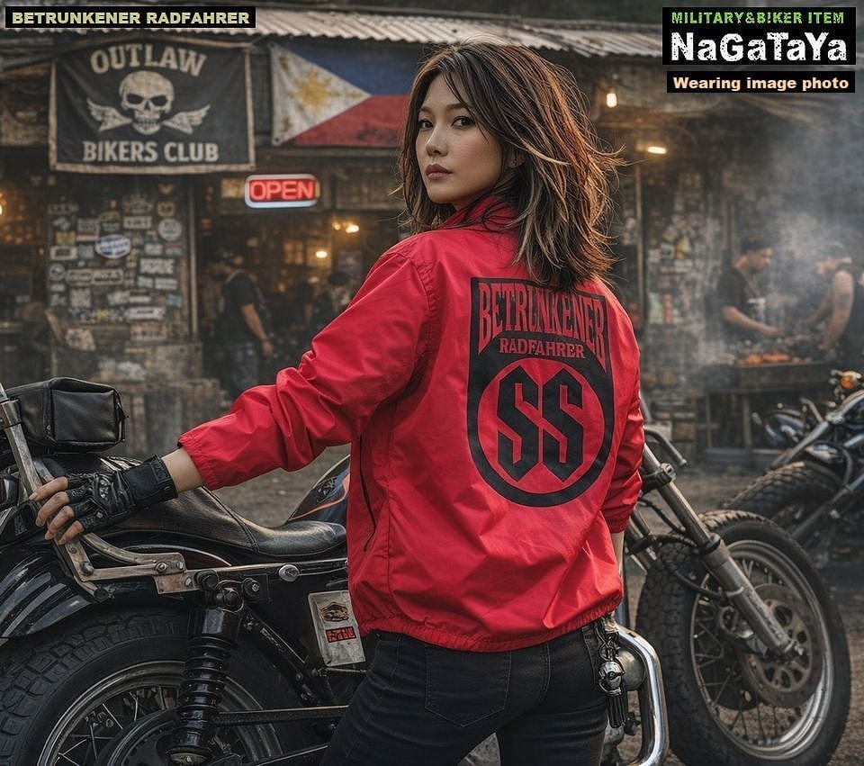 クラブスタイル BETRUNKENER RADFAHRER ベェトォンナ ラドファ エンブレム コーチジャケット レット×ブラック バイカー MC