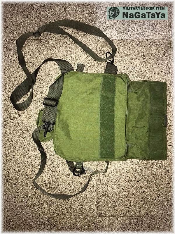 ■軍モノだけあって機能的な造りです。ショルダーバッグですが 上から出し入れする タイプでなく前から(横から)出し入れします。座った状態でも素早く取り出せるという機能的なつくりです。開け閉めはベルクロだから簡単!中はシンプルに1つの空間 中にベルクロで留められた大きめのポケットと小さめの9×12cmのポケットあり。外側の名前札の下も 9×14cmのポケットあり。 外側にはもう一つ マチ付き9×9×6cm のポケットあり。ショルダーストラップ以外にもう一つウエストや 腿に巻くストラップがあります。 これはバッグが動かないように体に固定させる物です。