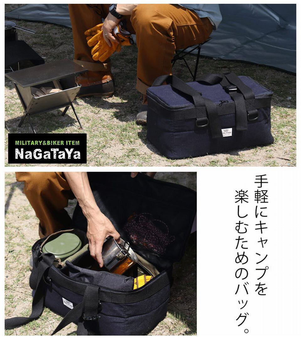 インディゴデニムを使用したキャンプバッグ。キャンプにいくほど色落ちがすすむ、キャンプとともにエイジングが楽しめるアイテム。