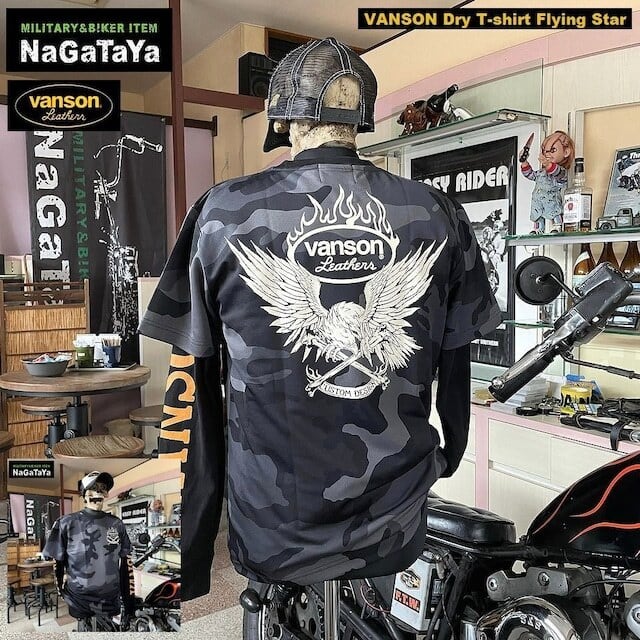 ■バンソン VANSONのドライ半袖Tシャツ。フライングイーグルのデザインがカッコいい一枚。ドライ生地で吸汗速乾性に優れ、UVカットも備えています。夏場のアウトドアやスポーツシーンで活躍すること間違いなし。UVカット機能もあり、紫外線対策にも安心です。