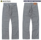 ■ブーツカットシルエットのヒッコリージーンズ。細すぎず太すぎない程よいシルエットのブーツカットジーンズ。裾部分のフレアも控えめにわずかに広がりを利かせたブーツカットシルエットです。極端なブーツカットではなく緩やかに裾を広げたブーツカットなのでスニーカーなどでコーディネートしても合わせやすいです。