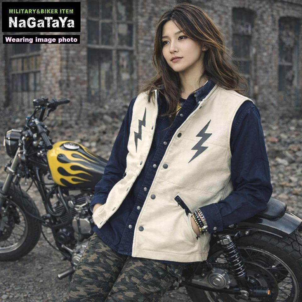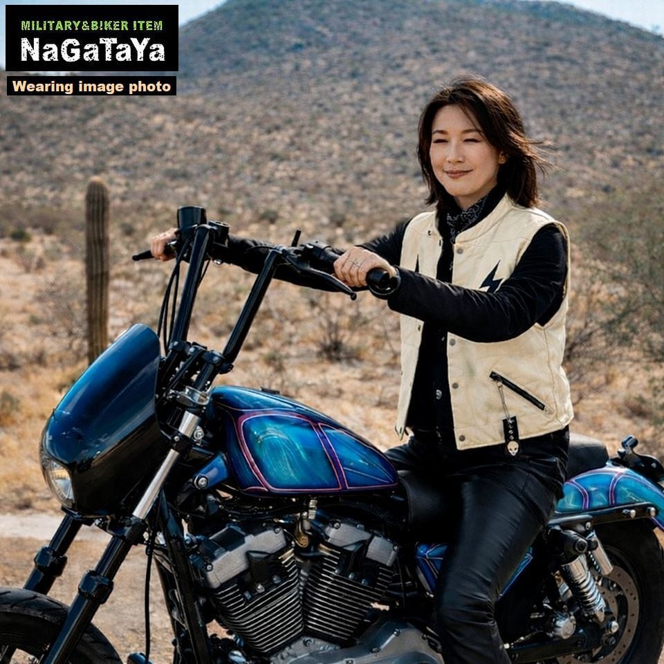 ■チョッパーシーンに馴染みのあるエッジの効いたパターンをボディに落とし込んだ「レザー ナーティーベスト」。 アイボリー部分にはエイジングを施し(汚し加工)、やれた雰囲気を演出。 中綿には、保温性に優れたシンサレートを採用。冬のライディングにもバッチリです。